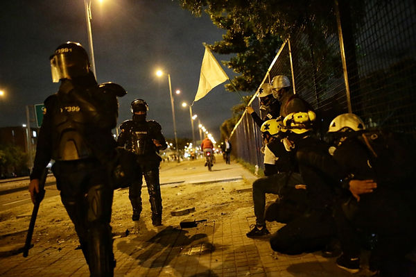 El enfrentamiento en el Portal Américas, rebautizado como Portal Resistencia, no se ha acabado desde el inicio del paro, solo se ha suspendido. Esta noche, el 26 de mayo, no es la excepción. Mientras actúa la fuerza pública y la primera línea trata de hacerlos retroceder a punta de piedra, la misión médica corre amparada en un estandarte blanco atendiendo a quienes se retiran del frente víctimas de cualquier lesión.